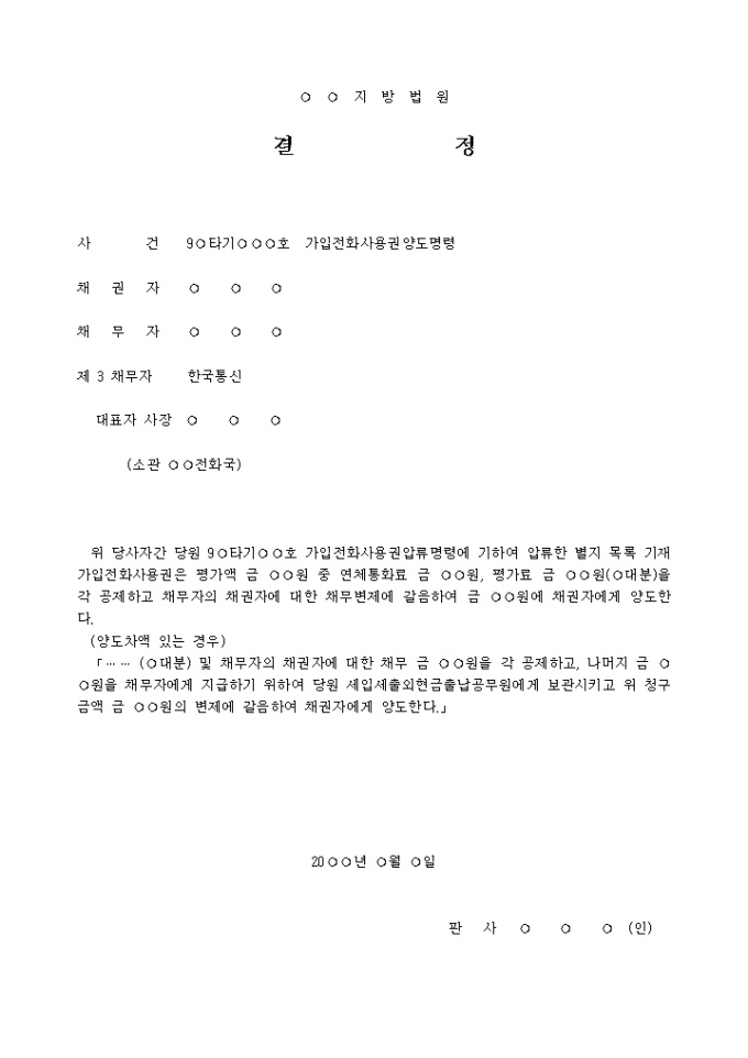 9,000원/월가입전화사용권(양도명령서) 입니다. 위 당사자간 당원 9○타기○○호 가입전화사용권압류명령에 기하여 압류한 별지 목록 기재 가입전화사용권은 평가액 금 ○○원 중 연체통화료 금 ○○원, 평가료 금 ○○원(○대분)을 각 공제하고 채무자의 채권자에 대한 채무변제에 갈음하여 금 ○○원에 채권자에게 양도한다. ...