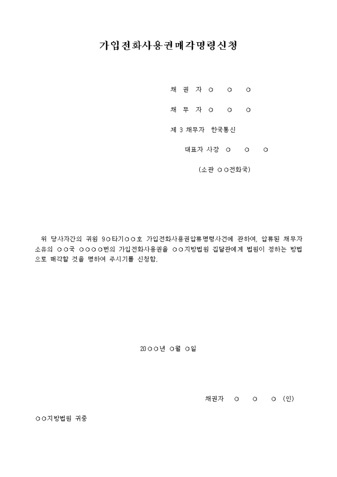 가입전화사용권매각명령신청서 입니다. 위 당사자간의 귀원 9○타기○○호 가입전화사용권압류명령사건에 관하여 , 압류된 채무자 소유의 ○○국 ○○○○번의 가입전화사용권을 ○○지방법원 집달관에게 법원이 정하는 방법으로 매각할 것을 명하여 주시기를 신청함. ...