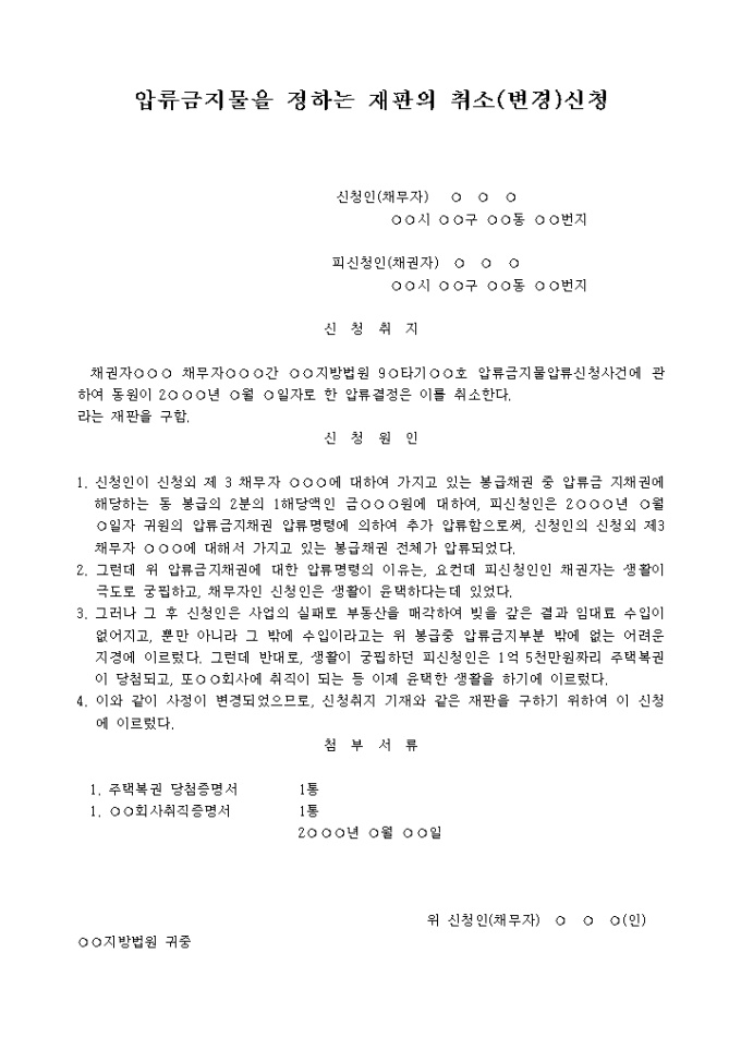 압류금지물 축소,확장재판의 취소(변경)신청서 예제 입니다.
