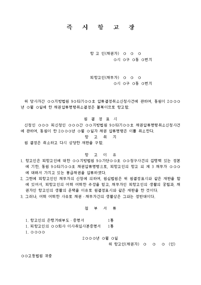 9,000원/월압류금지물지정재판(그 취소,확장,변경재판)에 대한 즉시항고장 입니다.