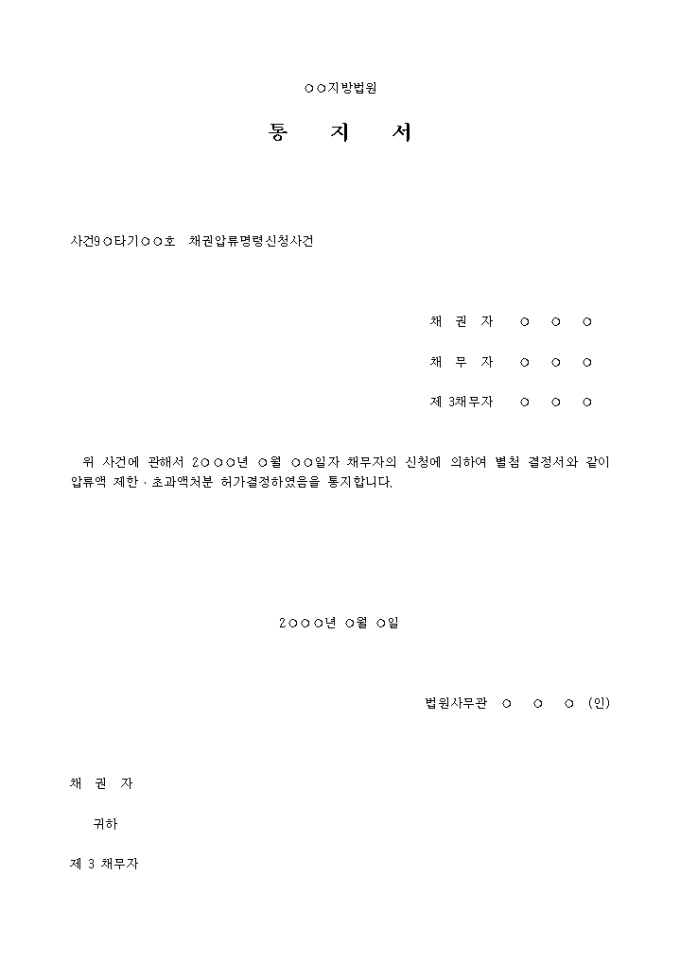 위 사건에 관해서 2○○○년 ○월 ○○일자 채무자의 신청에 의하여 별첨 결정서와 같이 압류액 제한․초과액처분 허가결정하였음을 통지합니다.