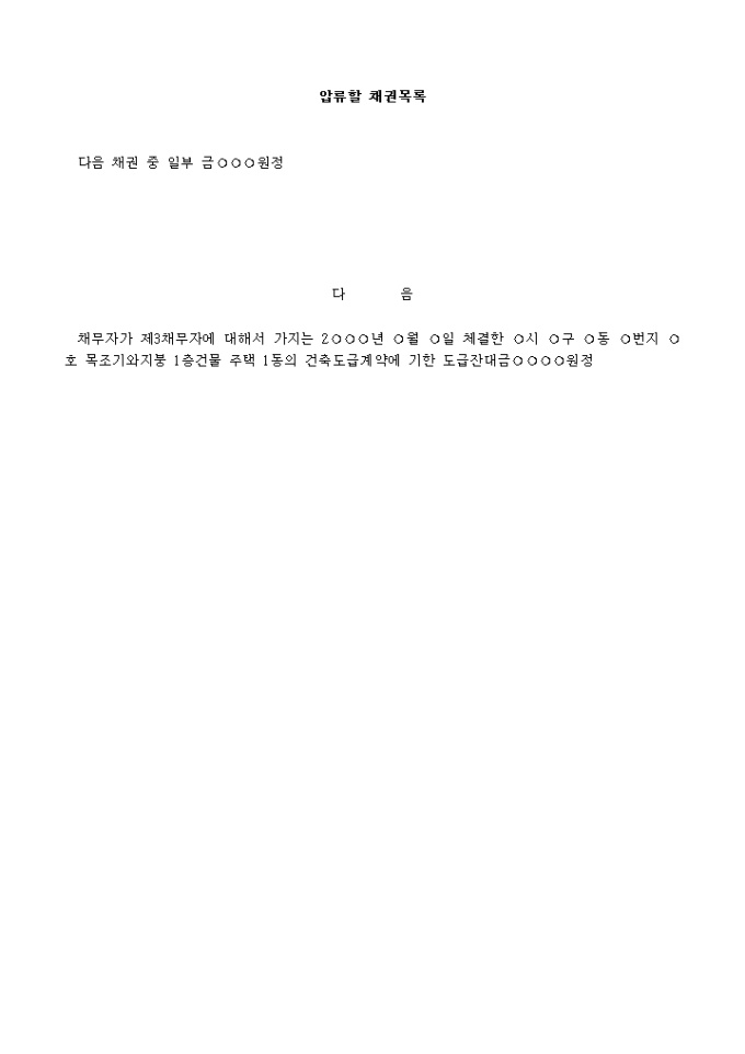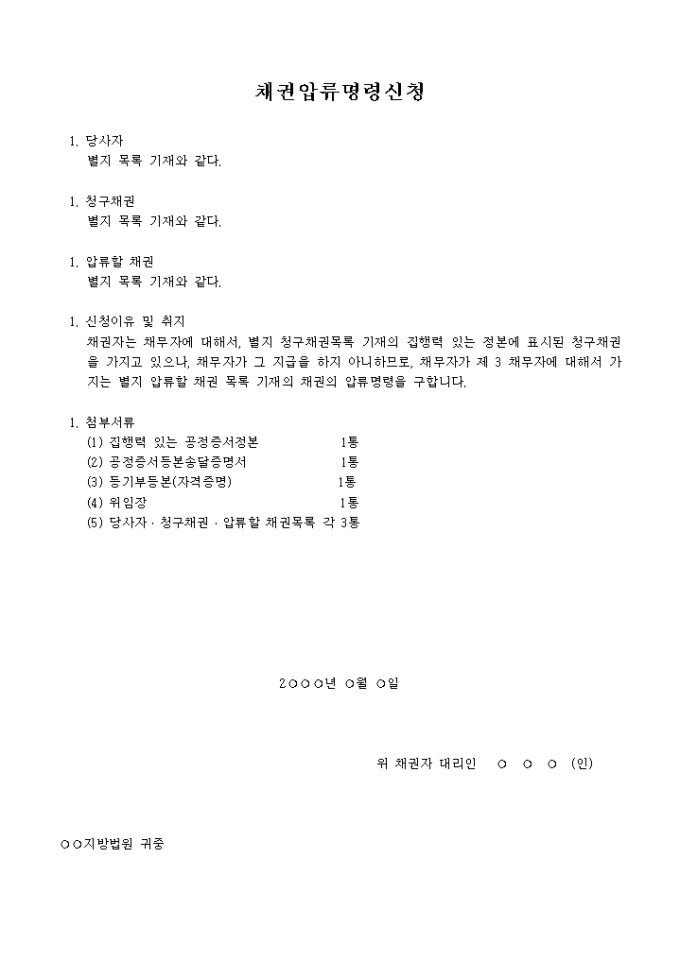 채권압류명령신청서 입니다. 1. 신청이유 및 취지 채권자는 채무자에 대해서, 별지 청구채권목록 기재의 집행력 있는 정본에 표시된 청구채권을 가지고 있으나 , 채무자가 그 지급을 하지 아니하므로, 채무자가 제 3 채무자에 대해서 가지는 별지 압류할 채권 목록 기재의 채권의 압류명령을 구합니다. ...