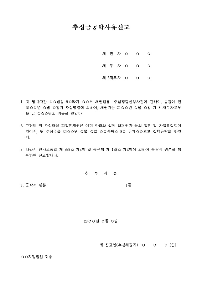 9,000원/월추심금공탁사유신고서 입니다. 1. 위 당사자간 ○○법원 9○타기 ○○호 채권압류 추심명령신청사건에 관하여 , 동원이 한 20○○년 ○월 ○일자 추심명령에 의하여 , 채권자는 20○○년 ○월 ○일 제 3 채무자로부터 금 ○○○원의 지급을 받았다. 2. 그런데 위 추심대상 피압류채권은 이미 아래와 같이 타채권자 등의 압류 및 가압류집행이 있어서, 위 추심금을 20○○년 ○월 ○일 ○○공탁소 9○ 금제○○호로 집행공탁을 하였다. ...