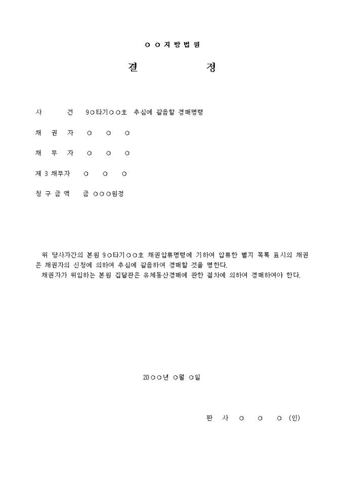 위 당사자간의 본원 9○타기○○호 채권압류명령에 기하여 압류한 별지 목록 표시의 채권은 채권자의 신청에 의하여 추심에 갈음하여 경매할 것을 명한다.
