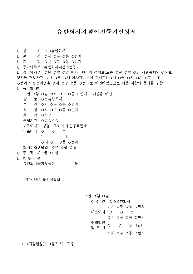1. 등기의사유 년 월 일 이사과반수의 결의로(또는 년 월 일 사원총회의 결의로 정관을 변경하고 년 월 일 이사과반수의 결의로) 년 월 일 시 구 동 번지의 지점을 시 구 동 번지로 이전하였으므로 다음 사항의 등기를 구함.