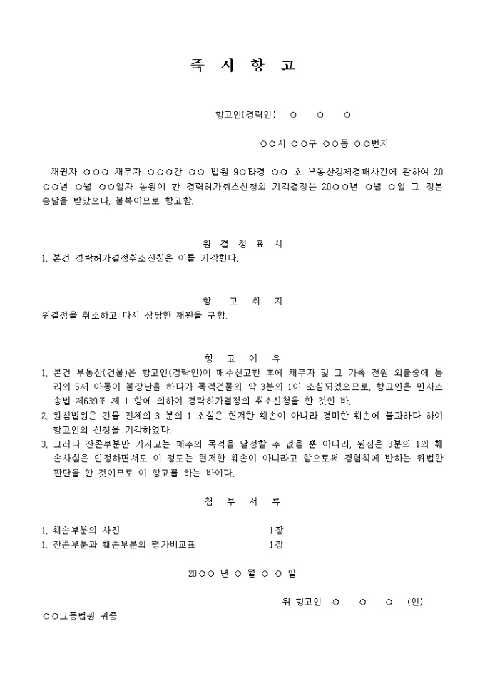 9,000원/월경락허가취소신청에 관한 결정(인용·배척)에 대한 즉시항고장 입니다.