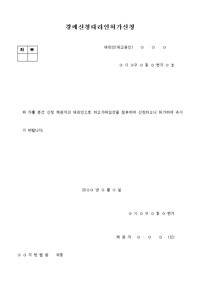 9,000원/월경매신청대리인허가신청서 입니다. 위 자를 본건 신청 채권자의 대리인으로 하고자위임장을 첨부하여 신청하오니 허가하여 주시기 바랍니다. ...