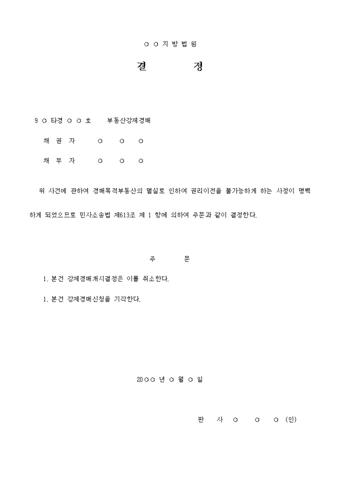 위 사건에 관하여 경매목적부동산의 멸실로 인하여 권리이전을 불가능하게 하는 사정이 명백하게 되었으므로 민사소송법 제613조 제 1 항에 의하여 주문과 같이 결정한다.