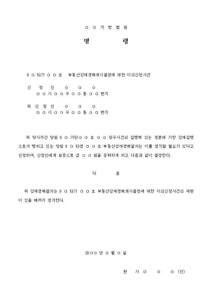 위 당사자간 당원 9 ○ 가단○ ○ 호 ○ ○ 청구사건의 집행력 있는 정본에 기한 강제집행으로서 행하고 있는 당원 9 ○ 타경 ○ ○ 호 부동산강재경매절차는 이를 정지할 필요가 있다고 인정하여, 신청인에게 보증으로 금 ○ ○ 원을 공탁하게 하고 다음과 같이 결정한다.