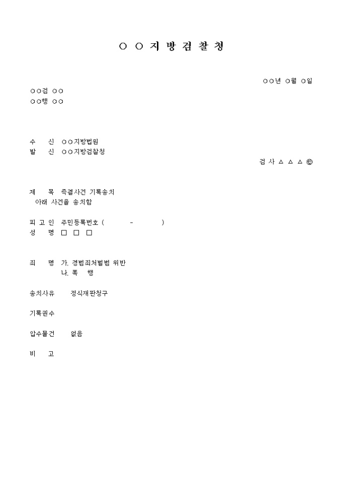 즉결사건송치서(검찰) 입니다. 제 목 즉결사건 기록송치 아래 사건을 송치함 피 고 인 주민등록번호 ( - ) 성 명 □ □ □ 죄 명 가. 경범죄처벌범 위반 나. 폭 행 송치사유 정식재판청구 ...