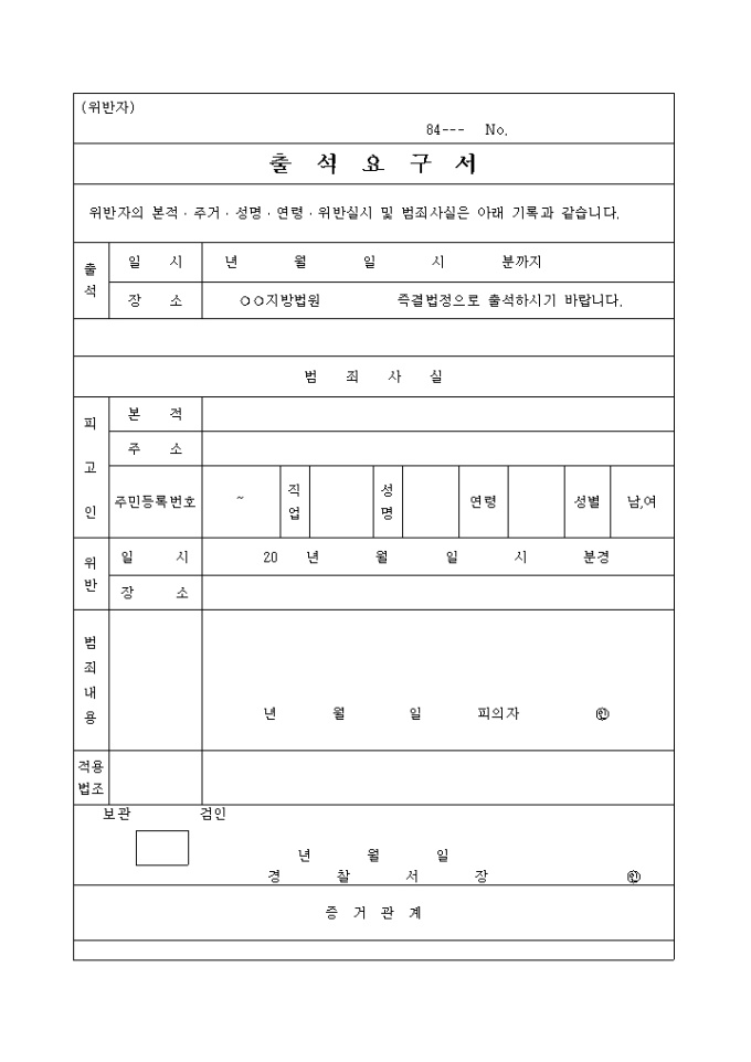 9,000원/월출석요구서 입니다. 위반자의 본적 주거 성명 연령 위반실시 및 범죄사실은 아래 기록과 같습니다. ...