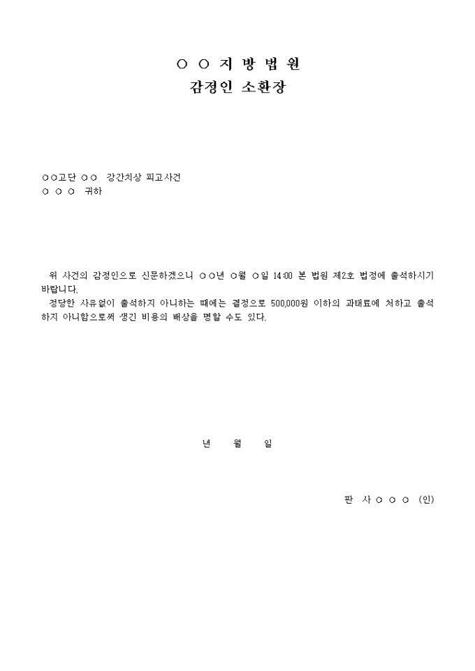 9,000원/월감정인소환장 입니다. ○○고단 ○○ 강간치상 피고사건 ○ ○ ○ 귀하 위 사건의 감정인으로 신문하겠으니 ○○년 ○월 ○일 14:00 본 법원 제2호 법정에 출석하시기 바랍니다. 정당한 사유없이 출석하지 아니하는 때에는 결정으로 500, 000원 이하의 과태료에 처하고 출석하지 아니함으로 써 생긴 비용의 배상을 명할 수도 있다. ...