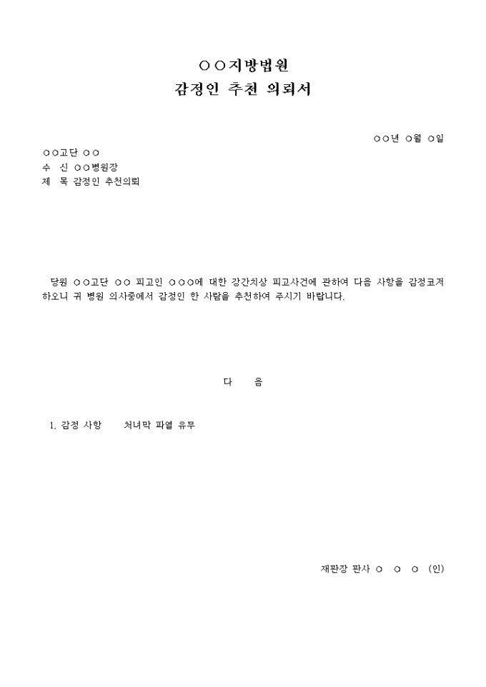 9,000원/월감정인추천의뢰서 입니다. ○○고단 ○○ 수 신 ○○병원장 제 목 감정인 추천의뢰 당원 ○○고단 ○○ 피고인 ○○○에 대한 강간치상 피고사건에 관하여 다음 사항을 감정코저 하오니 귀 병원 의사중에서 감정인 한 사람을 추천하여 주시기 바랍니다. ...