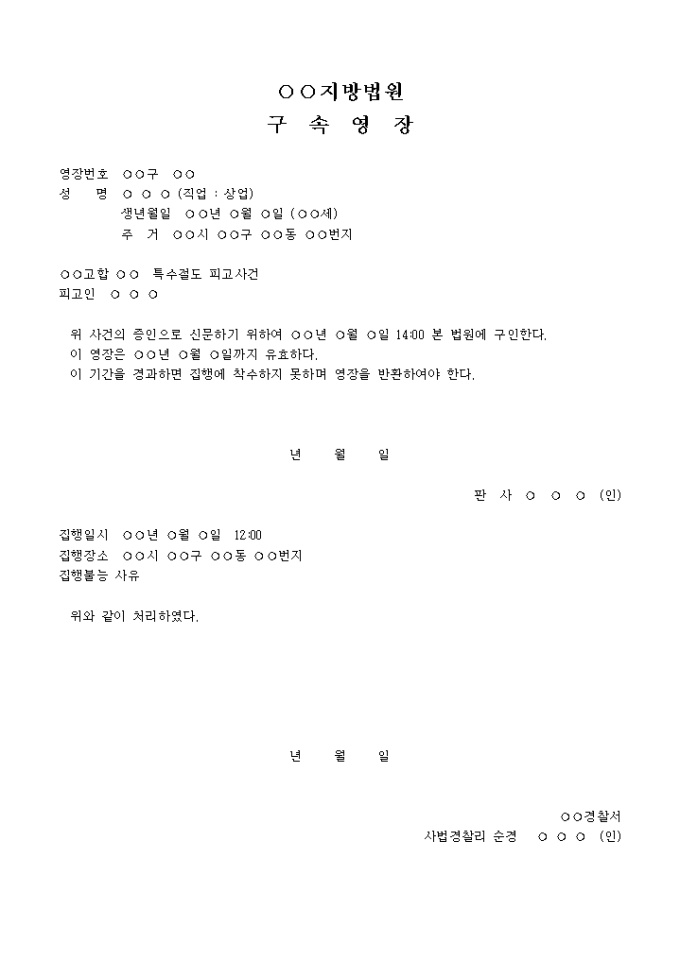 구속영장(증인에 대하여 -법원)(1) 입니다. ○○고합 ○○ 특수절도 피고사건 피고인 ○ ○ ○ 위 사건의 증인으로 신문하기 위하여 ○○년 ○월 ○일 14:00 본 법원에 구인한다. 이 영장은 ○○년 ○월 ○일까지 유효하다. 이 기간을 경과하면 집행에 착수하지 못하며 영장을 반환하여 야 한다. ...