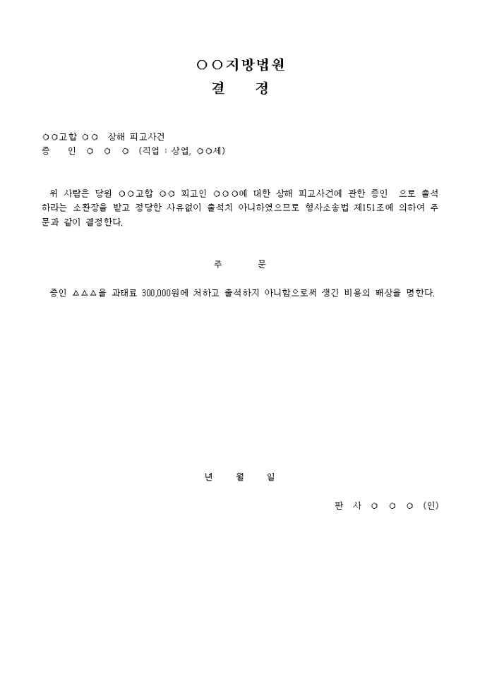 위 사람은 당원 ○○고합 ○○ 피고인 ○○○에 대한 상해 피고사건에 관한 증인 으로 출석하라는 소환장을 받고 정당한 사유없이 출석치 아니하였으므로 형사소송법 제151조에 의하여 주문과 같이 결정한다.