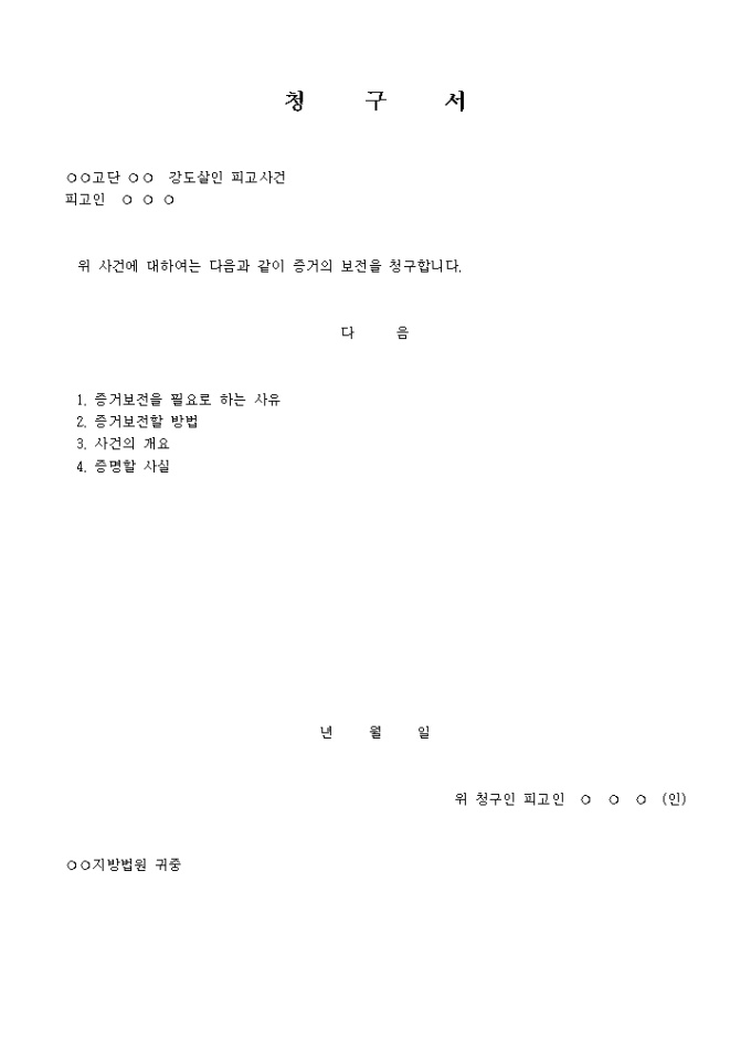 증거보전청구서(피고인) 입니다. ○○고단 ○○ 강도살인 피고사건 피고인 ○ ○ ○ 위 사건에 대하여 는 다음과 같이 증거의 보전을 청구합니다. ...