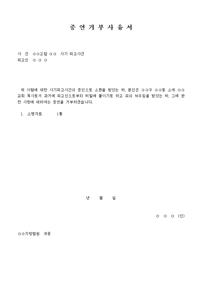 9,000원/월증언거부사유서 입니다. 사 건 ○○고합 ○○ 사기 피고사건 피고인 ○ ○ ○ 위 사람에 대한 사기피고사건의 증인으로 소환을 받았는 바, 본인은 ○○구 ○○동 소재 ○○교회 목사로서 과거에 피고인으로부터 비밀에 붙이기로 하고 죄의 뉘우침을 받았는 바, 그에 관한 사항에 대하여는 증언을 거부하겠습니다. ...