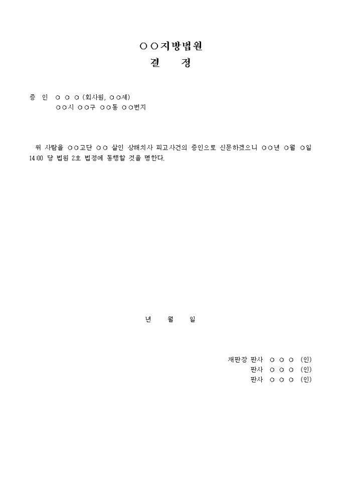 증인동행명령결정 입니다. 증 인 ○ ○ ○ (회사원, ○○세) ○○시 ○○구 ○○동 ○○번지 위 사람을 ○○고단 ○○ 살인 상해치사 피고사건의 증인으로 신문하겠으니 ○○년 ○월 ○일 14:00 당 법원 2호 법정에 동행할 것을 명한다. ....