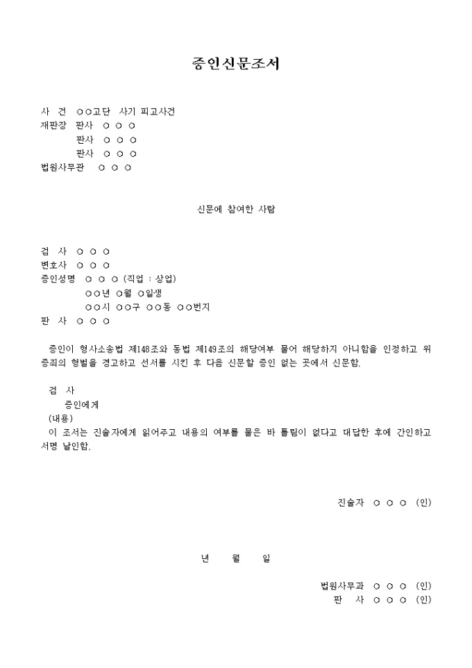 9,000원/월증인신문조서 입니다. 증인이 형사소송법 제148조와 동법 제149조의 해당여부 물어 해당하지 아니함을 인정하고 위증죄의 형벌을 경고하고 선서를 시킨 후 다음 신문할 증인 없는 곳에서 신문함. 검 사 증인에게 (내용) 이 조서는 진술자에게 읽어주고 내용의 여부를 물은 바 틀림이 없다고 대답한 후에 간인하고 서명 날인함. ...