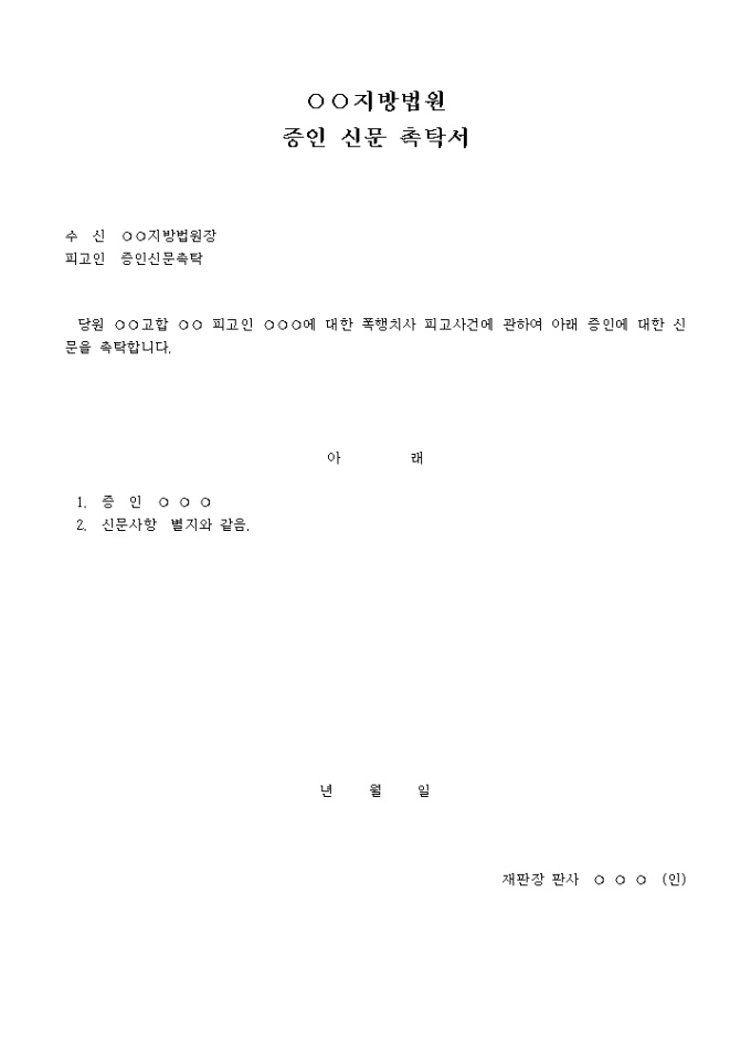 9,000원/월증인신문촉탁서 입니다. 수 신 ○○지방법원장 피고인 증인신문촉탁 당원 ○○고합 ○○ 피고인 ○○○에 대한 폭행치사 피고사건에 관하여 아래 증인에 대한 신문을 촉탁합니다. ...