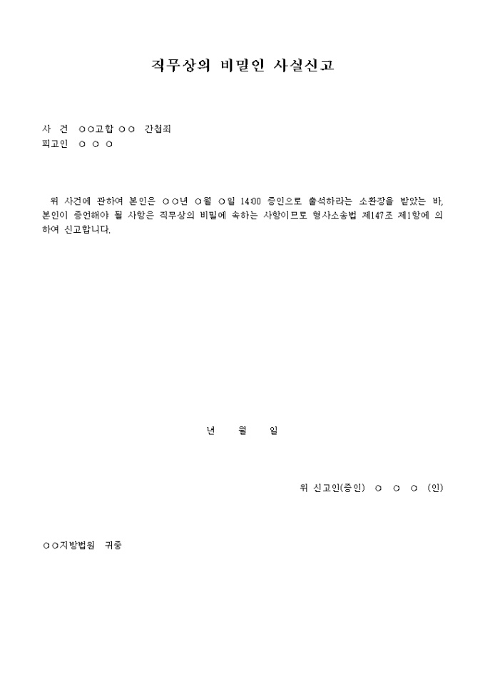 직무상의비밀인사실신고서 입니다. 사 건 고합 간첩죄 피고인 위 사건에 관하여 본인은 년 월 일 14:00 증인으로 출석하라는 소환장을 받았는 바, 본인이 증언해야 될 사항은 직무상의 비밀에 속하는 사항이므로 형사소송법 제147조 제1항에 의하여 신고합니다. ...