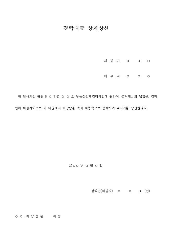 9,000원/월경락대금상계상신서 입니다. 위 당사자간 귀원 9 ○ 타경 ○ ○ 호 부동산강제경매사건에 관하여, 경락대금의 납입은, 경락인이 채권자이므로 위 대급에서 배당받을 액과 대등액으로 상계하여 주시기를 상신합니다. ...