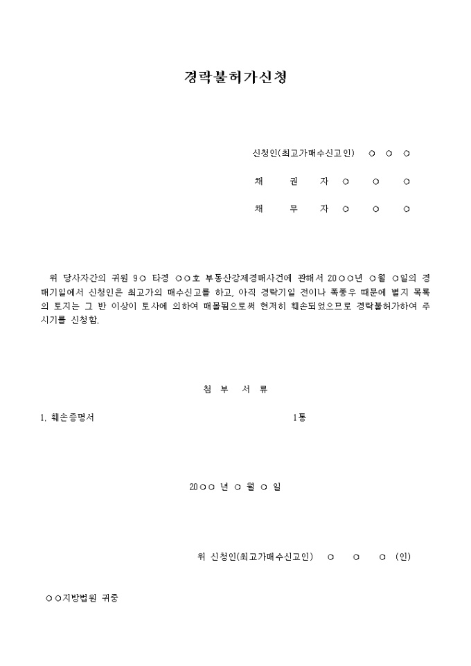 9,000원/월경락불허가신청서 입니다. 위 당사자간의 귀원 9○ 타경 ○○호 부동산강제경매사건에 관해서 20○○년 ○월 ○일의 경매기일에서 신청인은 최고가의 매수신고를 하고, 아직 경락기일 전이나 폭풍우 때문에 별지 목록의 토지는 그 반 이상이 토사에 의하여 매몰됨으로 써 현저히 훼손되었으므로 경락불허가하여 주시기를 신청함. ...