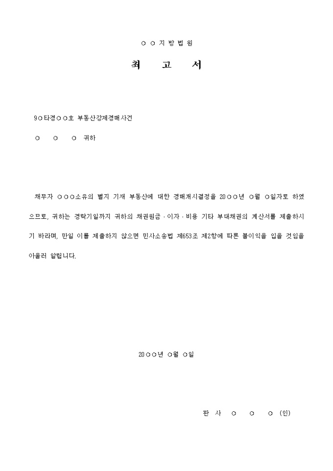 채무자 ○○○소유의 별지 기재 부동산에 대한 경매개시결정을 20○○년 ○월 ○일자로 하였으므로, 귀하는 경락기일까지 귀하의 채권원금․이자․비용 기타 부대채권의 계산서를 제출하시기 바라며, 만일 이를 제출하지 않으면 민사소송법 제653조 제2항에 따른 불이익을 입을 것임을 아울러 알립니다.