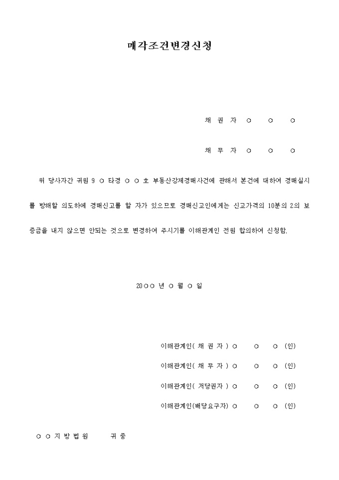 매각조건변경신청서 입니다. 위 당사자간 귀원 9 ○ 타경 ○ ○ 호 부동산강제경매사건에 관해서 본건에 대하여 경매실시를 방해할 의도하에 경매신고를 할 자가 있으므로 경매신고인에게는 신고가격의 10분의 2의 보증금을 내지 않으면 안되는 것으로 변경하여 주시기를 이해관계인 전원 합의하여 신청함. , , ,