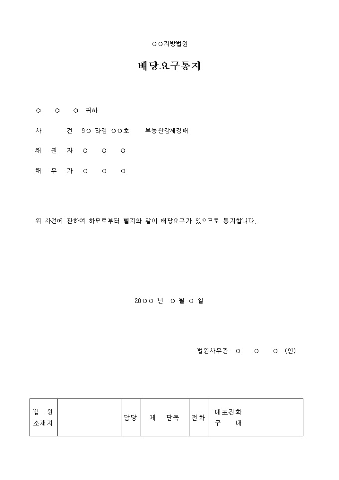 9,000원/월배당요구통지서 입니다. ○ ○ ○ 귀하 사 건 9○ 타경 ○○호 부동산강제경매 채 권 자 ○ ○ ○ 채 무 자 ○ ○ ○ 위 사건에 관하여 하모로부터 별지와 같이 배당요구가 있으므로 통지합니다. ...