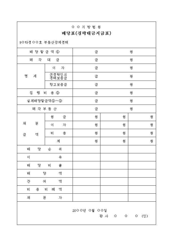 9,000원/월배당표입니다. 배 당 할 금 액 ① 매 각 대 금 명 세 이 자 전경락인의 경매보증금 항고보증금 집 행 비 용 ② 실제배당할금액①∼② 매 각 부 동 산 의 항목으로 구성된 양식입니다.