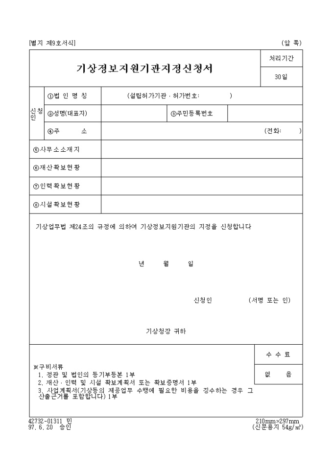 9,000원/월기상업무법 제24조의 규정에 의하여 기상정보지원기관의 지정을 신청하고자 할 때 사용하는 기상정보 지원기관 지정신청서 양식입니다.