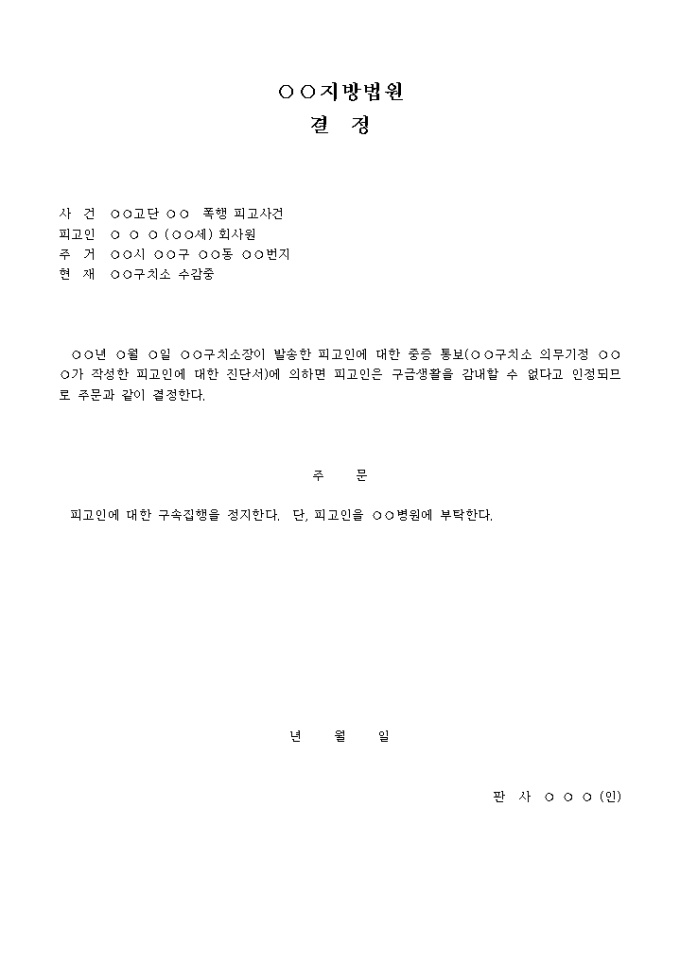 9,000원/월구속집행정지결정 입니다. ○○년 ○월 ○일 ○○구치소장이 발송한 피고인에 대한 중증 통보(○○구치소 의무기정 ○○○가 작성한 피고인에 대한 진단서)에 의하면 피고인은 구금생활을 감내할 수 없다고 인정되므로 주문과 같이 결정한다. 주 문 피고인에 대한 구속집행을 정지한다. 단, 피고인을 ○○병원에 부탁한다. ...