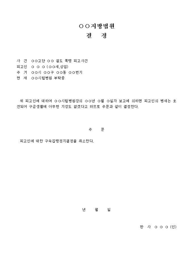 구속집행정지취소결정(정지사유소멸) 입니다. 위 피고인에 대하여 ○○시립병원장의 ○○년 ○월 ○일자 보고에 의하면 피고인의 병세는 호전되어 구금생활에 아무런 지장도 없겠다고 하므로 주문과 같이 결정한다. 주 문 피고인에 대한 구속집행정지결정을 취소한다. ...