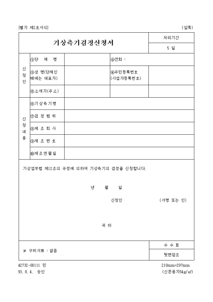 9,000원/월기상업무법 제12조의 규정에 의하여 기상측기의 검정을 신청할 때 사용하는 기상측기 검정신청서 양식입니다.
