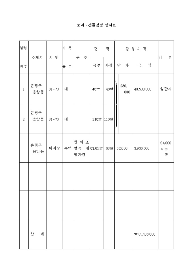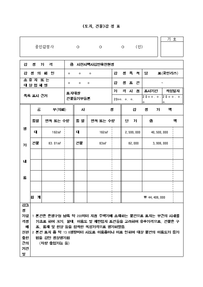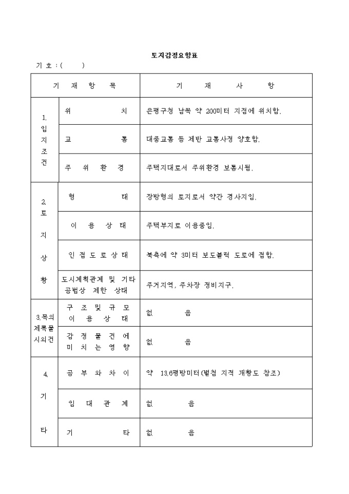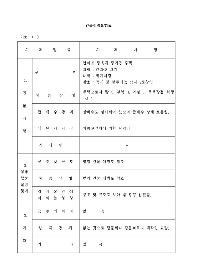 9,000원/월평가서 입니다. 1 본건은 은평구청 남쪽 약 200미터 지점 주택가에 소재하는 물건으로 토지는 부근의 시세를기초로 하여 크기, 형태, 이용도 및 제반입지 조건등을 고려하여 유추가격으로 , 건물은 구조, 용재 및 현상 등을 참작한 복성가격으로 평가하였음. 2 본건 토지 중 약 13.6평방미터 사도로 이용중이나 이로 인하여 대상 물건의 이용도가 증가됨을 감안 정상평가함. (차량 출입가능 등) ...