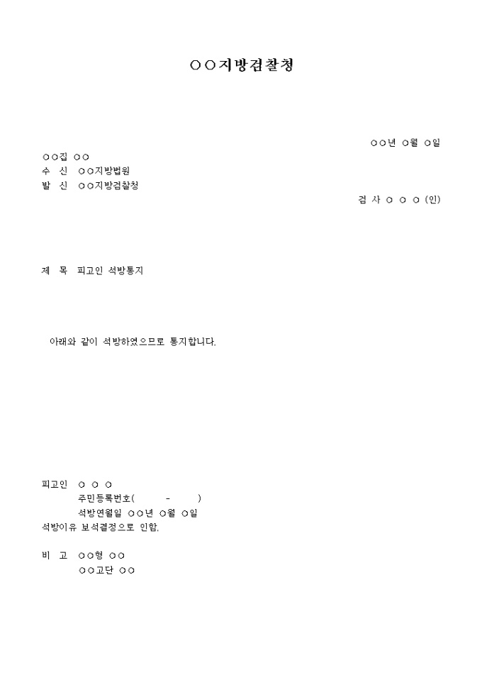피고인석방통지서 입니다. 제 목 피고인 석방통지 아래와 같이 석방하였으므로 통지합니다. ...