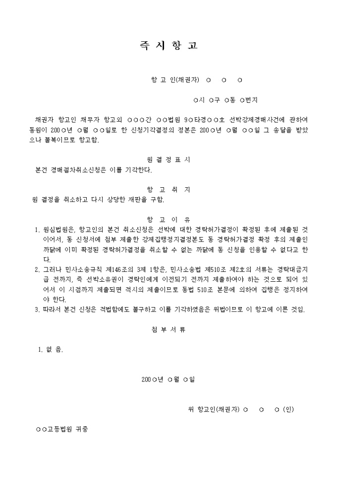 경매절차취소신청기각결정에 대한 즉시항고장 입니다.