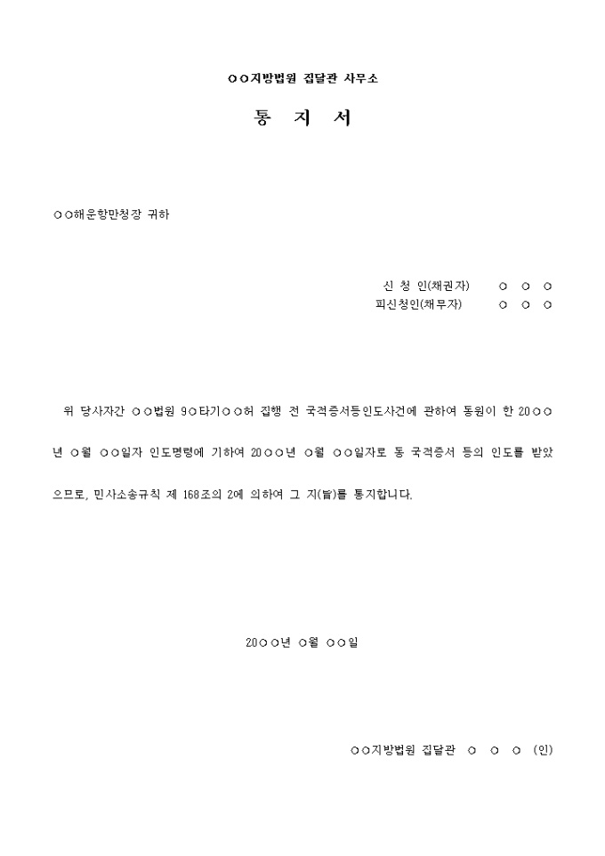 위 당사자간 ○○법원 9○타기○○허 집행 전 국적증서등인도사건에 관하여 동원이 한 20○○년 ○월 ○○일자 인도명령에 기하여 20○○년 ○월 ○○일자로 동 국적증서 등의 인도를 받았으므로, 민사소송규칙 제 168조의 2에 의하여 그 지(旨)를 통지합니다.
