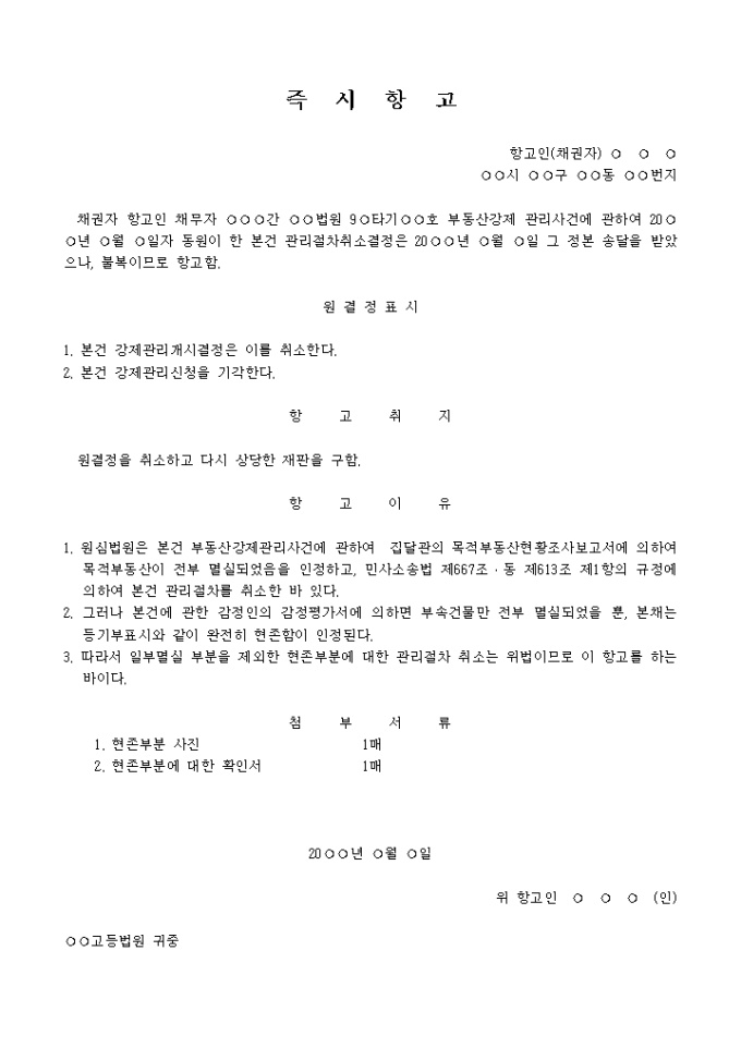 멸실에 의한 취소(강제관리취소결정에 대한 즉시항고장) 입니다.