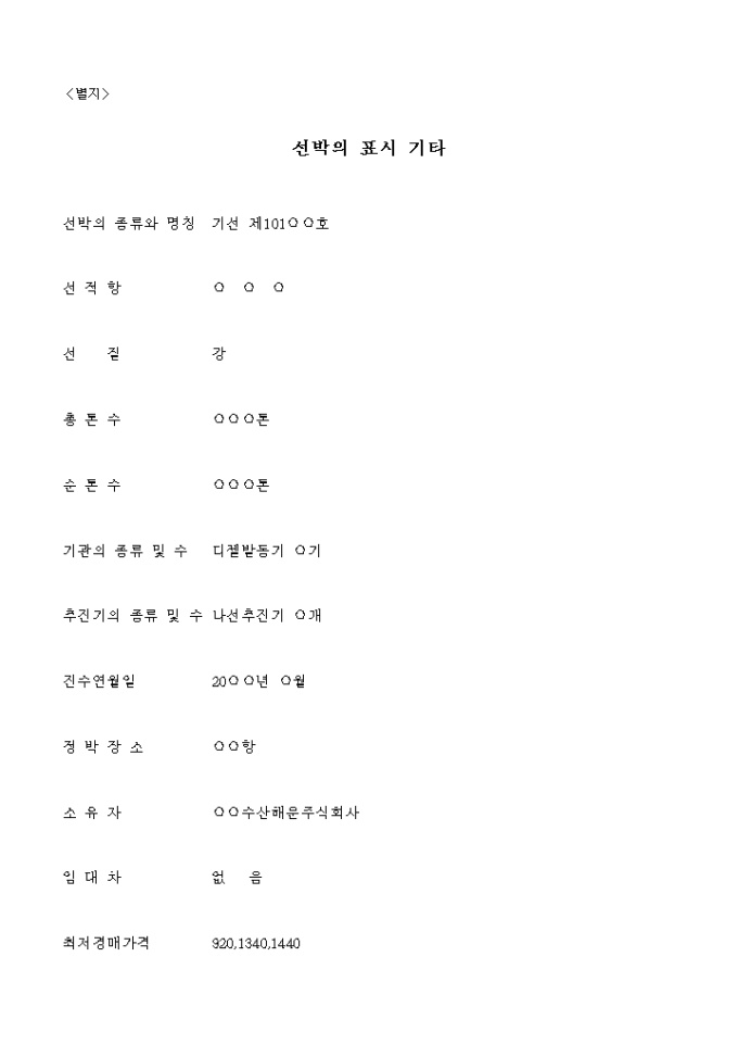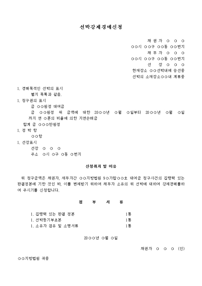 9,000원/월선박강제경매신청서 입니다. 신청취지 및 이유 위 청구금액은 채권자, 재무자간 ○○지방법원 9○가합○○호 대여금 청구사건의 집행력 있는 판결정본에 기한 것인 바, 이를 변제받기 위하여 채무자 소유의 위 선박에 대하여 강제경매를하여 주시기를 신청합니다. ...