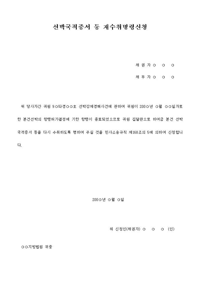 위 당사자간 귀원 9○타경○○호 선박강제경매사건에 관하여 귀원이 200○년 ○월 ○○일자로 한 본건선박의 항행허가결정에 기한 항행이 종료되었으므로 귀원 집달관으로 하여금 본건 선박국적증서 등을 다시 수취하도록 명하여 주실 것을 민사소송규칙 제168조의 5에 의하여 신청합니다.