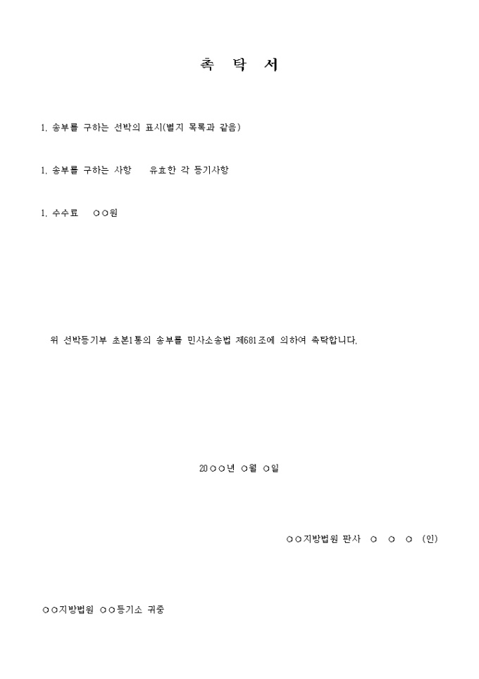 위 선박등기부 초본1통의 송부를 민사소송법 제681조에 의하여 촉탁합니다.