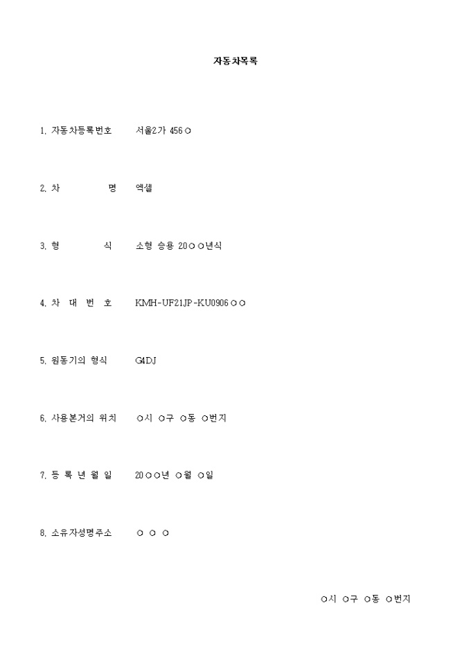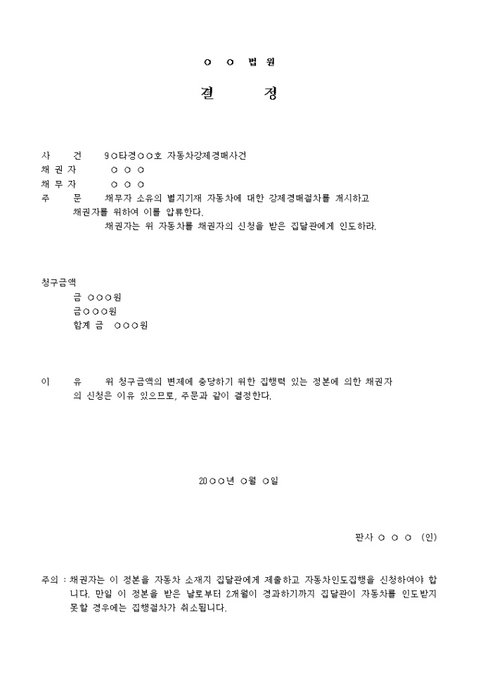 9,000원/월개시결정서-1 입니다. 주 문 채무자 소유의 별지기재 자동차에 대한 강제경매절차를 개시하고 채권자를 위하여 이를 압류한다. 채권자는 위 자동차를 채권자의 신청을 받은 집달관에게 인도하라. 청구금액 금 ○○○원 금○○○원 함계 금 ○○○원 이 유 위 청구금액의 변제에 충당하기 위한 집행력 있는 정본에 의한 채권자의 신청은 이유 있으므로, 주문과 같이 결정한다. ....