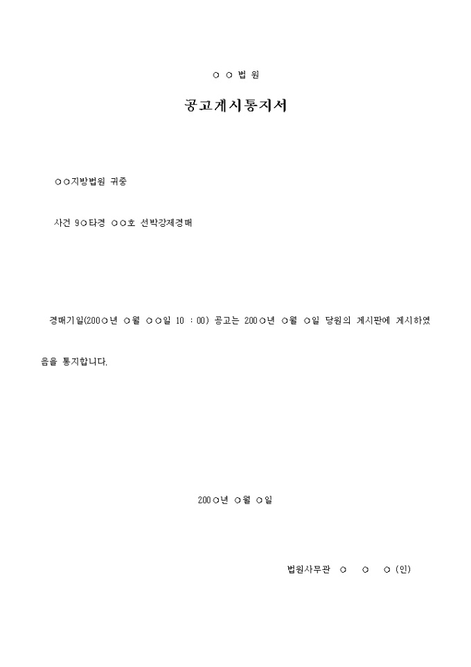 공고게시통지서 입니다. 지방법원 귀중 사건 9 타경 호 선박강제경매 경매기일(200 년 월 일 10 : 00) 공고는 200 년 월 일 당원의 게시판에 게시하였음을 통지합니다. ...