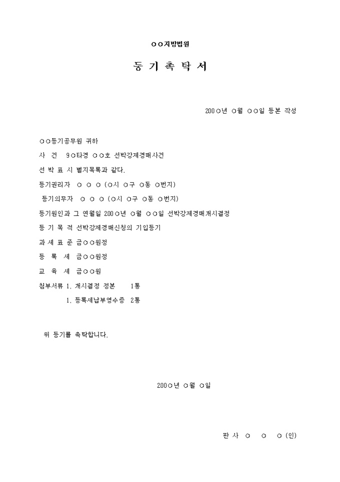 등기촉탁서 입니다. 등기원인과 그 연월일 200○년 ○월 ○○일 선박강제경매개시결정 등 기 목 적 선박강제경매신청의 기입등기 ...