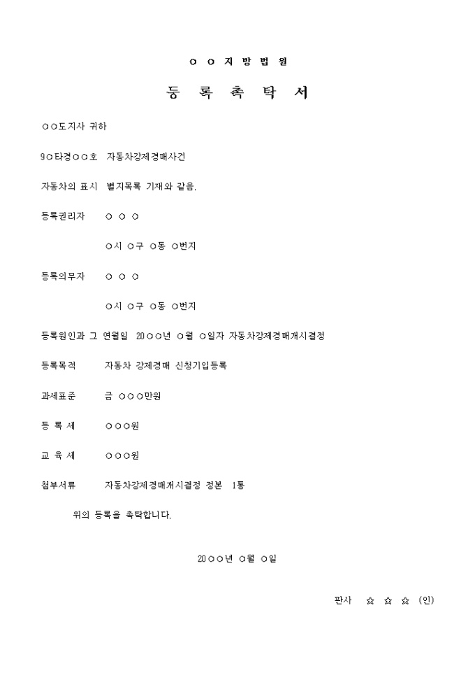 등록촉탁서 입니다. 등록원인과 그 연월일 20○○년 ○월 ○일자 자동차강제경매개시결정 등록목적 자동차 강제경매 신청기입등록 ...