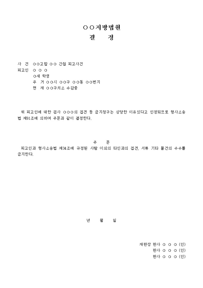 9,000원/월접견등금지결정 입니다. 위 피고인에 대한 검사 ○○○의 접견 등 금지청구는 상당한 이유있다고 인정되므로 형사소송법 제91조에 의하여 주문과 같이 결정한다. 주 문 피고인과 형사소송법 제34조에 규정된 사람 이외의 타인과의 접견, 서류 기타 물건의 수수를 금지한다. ...