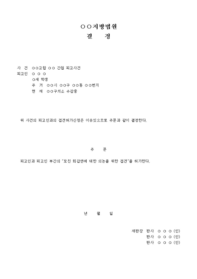 9,000원/월접견허가결정 입니다. 위 사건의 피고인과의 접견허가신청은 이유있으므로 주문과 같이 결정한다. 주 문 피고인과 피고인 부간의 “모친 회갑연에 대한 의논을 위한 접견“을 허가한다. ...