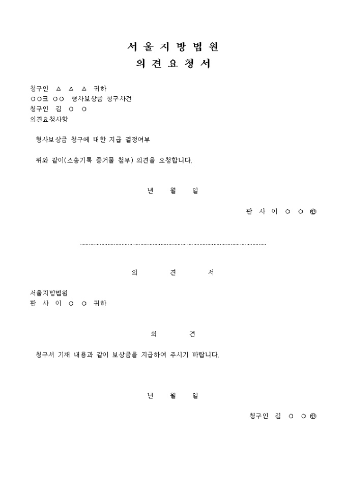 9,000원/월의견요청서(청구인) 입니다. 청구인 △ △ △ 귀하 ○○코 ○○ 형사보상금 청구사건 청구인 김 ○ ○ 의견요청사항 형사보상금 청구에 대한 지급 결정여부 위와 같이(소송기록 증거물 첨부) 의견을 요청합니다. ...